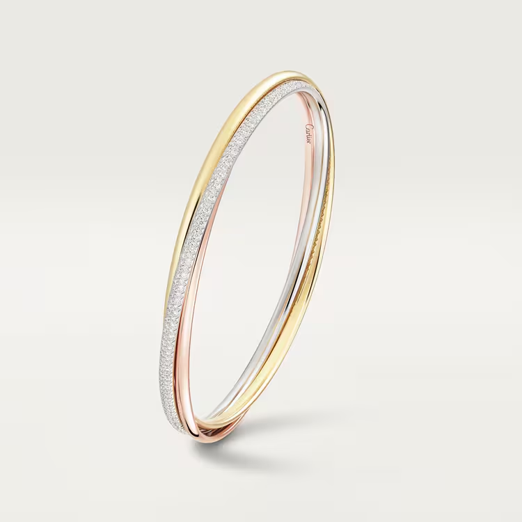 سوار "ترينيتي"، موديل الحجم الصغير، مصنوع من الذهب الأبيض 750/1000 والذهب الوردي 750/1000 والذهب الأصفر 750/1000، ومرصّع بـ 352 ماسة بقطع بريانت الحديث البرّاق تزن معًا 1.56 قيراط (للمقاس 17).