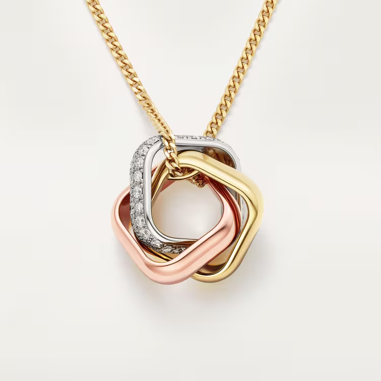 قلادة "ترينيتي"، مصنوعة من الذهب الأبيض 750/1000، والذهب الوردي 750/1000، والذهب الأصفر 750/1000، ومرصّعة بـ 54 ماسة بقطع بريانت الحديث البرّاق تزن معًا 0.39 قيراط، والسلسلة من الذهب الأصفر 750/1000. طول السلسلة 60 سم.