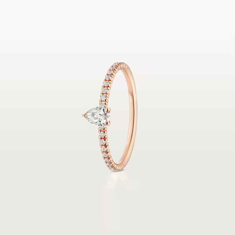 خاتم "إتانسيل دو كارتييه"، مصنوع من الذهب الوردي 750/1000، ومرصّع بماسة مركزية بشكل الكمثرى تزن 0.16 قيراط و22 ماسة بقطع بريانت الحديث البرّاق تزن معًا 0.10 قيراط. العرض 1.52 مم. السماكة 1.35 مم (للمقاس 52).